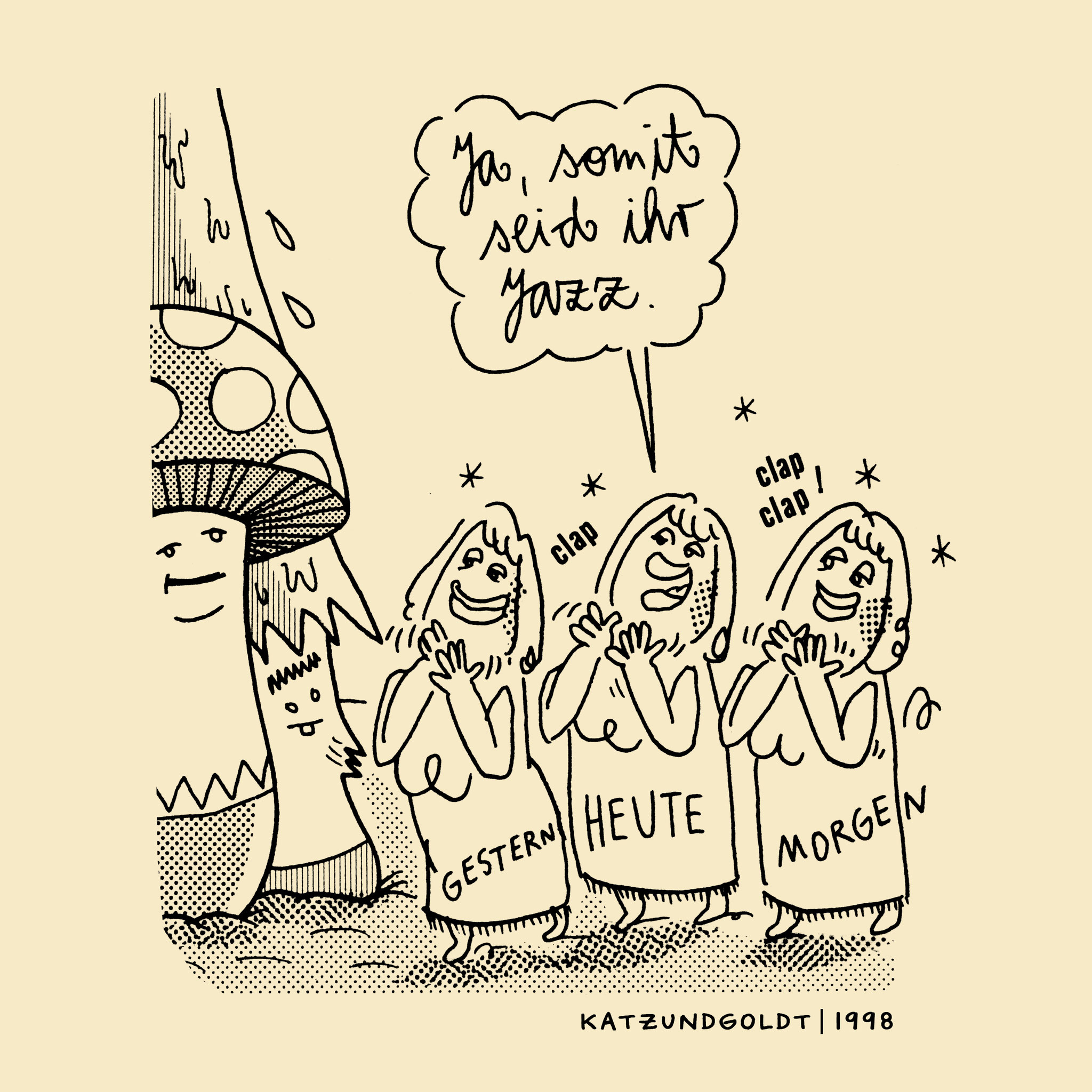 Die ersten drei Bücher von Katz & Goldt erschienen in den Jahren 1997-1999 im Berliner Comic-Verlag "Jochen Enterprises", welcher aufgrund der üblichen finanziellen Widrigkeiten im Jahr 2000 das Zeitliche segnete. Leute, die wissen möchten, wie Katz & Goldt-Zeichnungen vor über 25 Jahren ausgesehen haben, können hier eine signierte Rarität zusammen mit einer Katz & Goldt-Risographie erwerben.