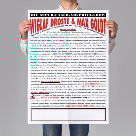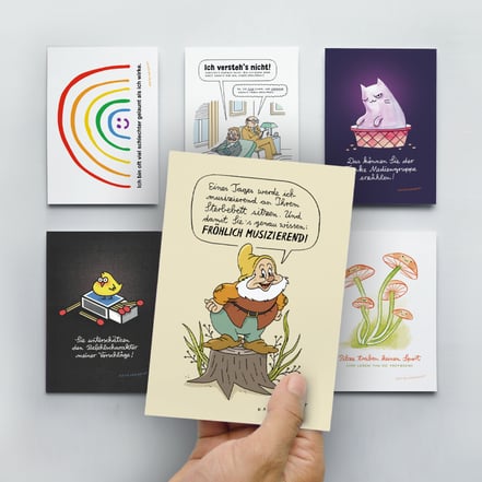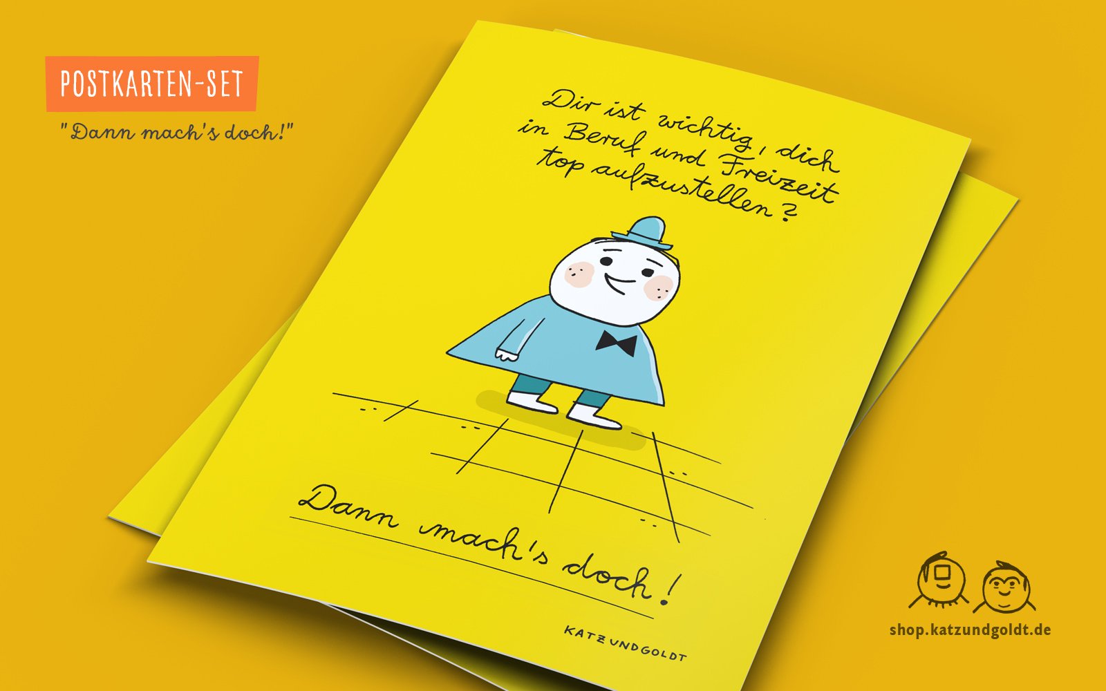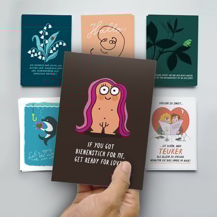 Objekte mit Souvenircharakter: Postkarten-Sets, signierte Bücher-Bündel sowie Katz & Goldt-Risographie-Plakate.
